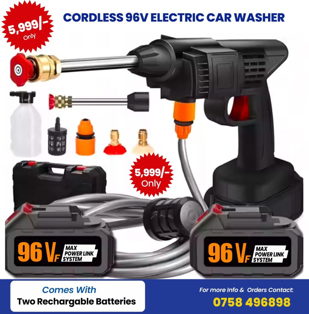 The 96V Car Washer Gun is a cordless, high-pressure cleaning device that runs on a rechargeable 96-volt lithium battery. Its primary use is to clean cars, but its application extends far beyond that. With its lightweight body and easy-to-use design, it’s suitable for cleaning bicycles, outdoor furniture, garden tools, windows, fences, patios, and even watering plants. Whether you’re at home, on a road trip, or living in an apartment with limited access to water, this device offers an effective solution for quick and efficient cleaning.